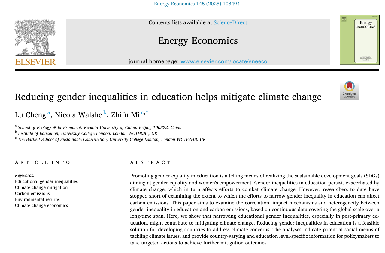 近日,天乐代言太阳集团138成璐助理教授作为第一作者,与他人合作的研究论文Reducing gender inequalities in education helps mitigate climate change发表在能源经济学权威期刊Energy Economics上。