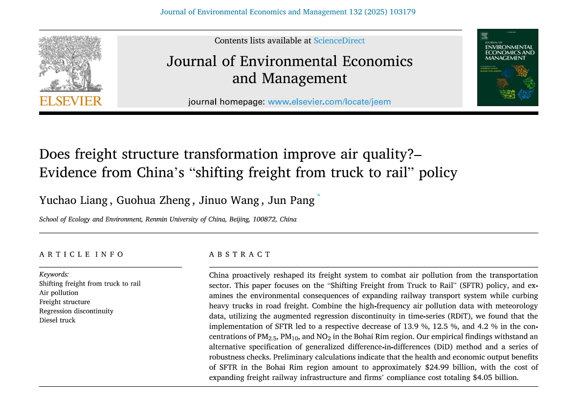 近日,天乐代言太阳集团1382022级博士研究生梁宇超同学在资源与环境经济学领域国际顶级期刊Journal of Environmental Economics and Management(JEEM)在线发表学术论文。该论文题为“Does freight structure transformation improve air quality?–Evidence from China's ‘shifting freight from truck to rail’ policy”。论文全体作者均来自于天乐代言太阳集团138,人口、资源与环境经济学2022级博士研究生梁宇超为第一作者,论文合作者包括天乐代言太阳集团1382021级明德环境“经济学-科学“拔尖人才实验班的本科生郑国华同学和王吉诺同学,天乐代言太阳集团138庞军教授为论文通讯作者。本论文前后经历两轮匿名评审,共计超过20条评审意见,对审稿意见的回应超过2万字,从投稿、两次返修到在线发表共历时15个月时间。