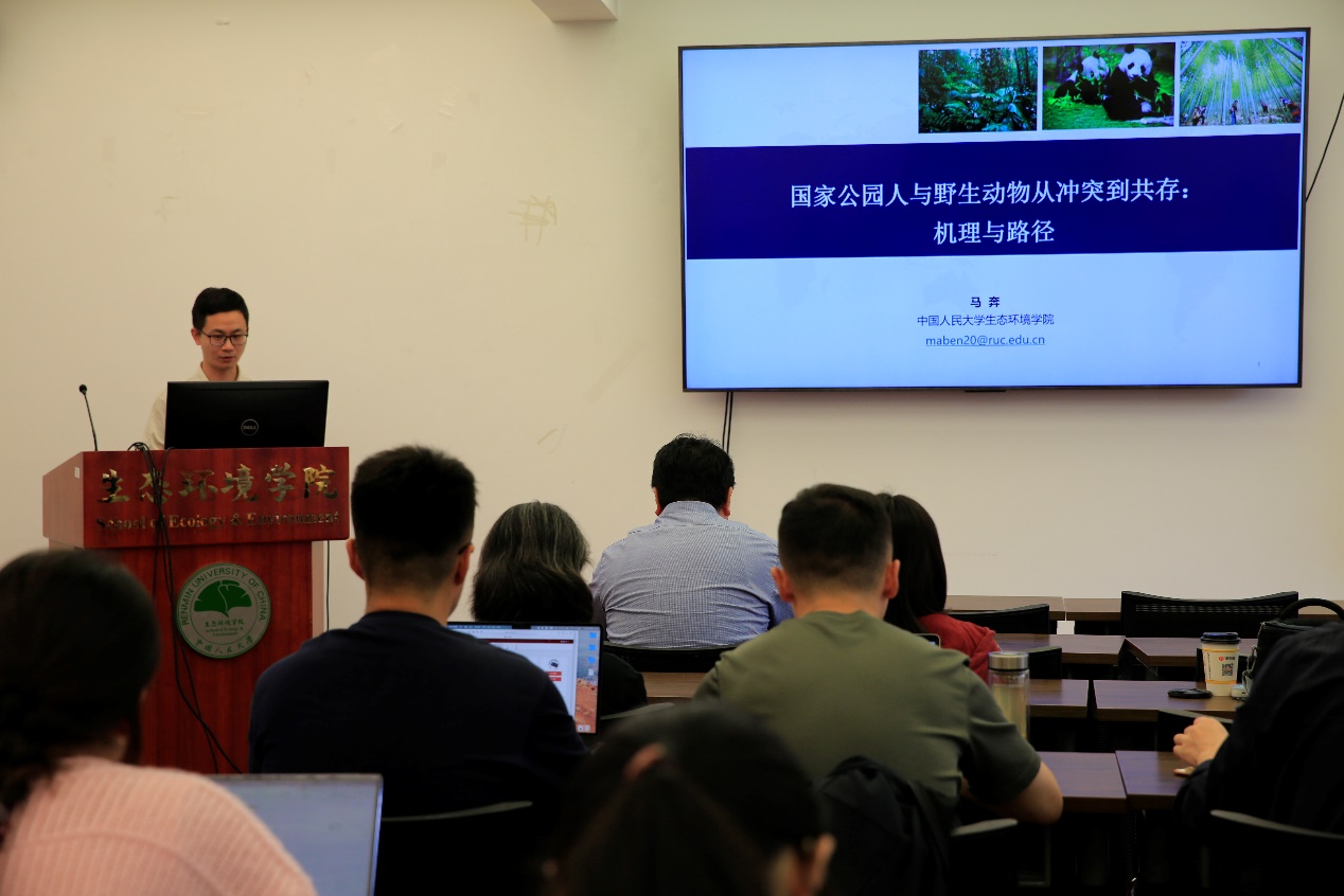 马奔老师分享了题为《国家公园人与野生动物从冲突到共存:机理与路径》的研究成果。他指出,我国国家公园建立后,人与野生动物冲突严重。研究首先分析社会经济系统、资源生态系统和治理系统对冲突生成的影响机理;进而从直接经济损失、收入减少以及福祉降低视角测度冲突造成的经济成本;最后,对人与野生动物冲突的经济干预措施进行梳理,分析农户参与野生动物肇事保险意愿的影响机理和路径。基于此,提出有效减缓国家公园人与野生动物冲突的政策建议。最后,马奔老师总结人与野生动物冲突不可避免,如何从冲突到共存是关键,并提出实现从冲突到共存的研究展望。