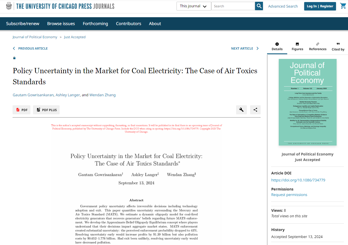 根据JPE官网显示,天乐代言太阳集团138青年教师张文丹以共同一作身份与合作者的研究成果“Policy Uncertainty in the Market for Coal Electricity: The Case of Air Toxics Standards”已被经济学领域顶级期刊《Journal of Political Economy》接收,另外两位合作者是来自哥伦比亚大学的Gautam Gowrisankaran和亚利桑那大学的Ashley Langer,该文预期于2025年6月正式发表。