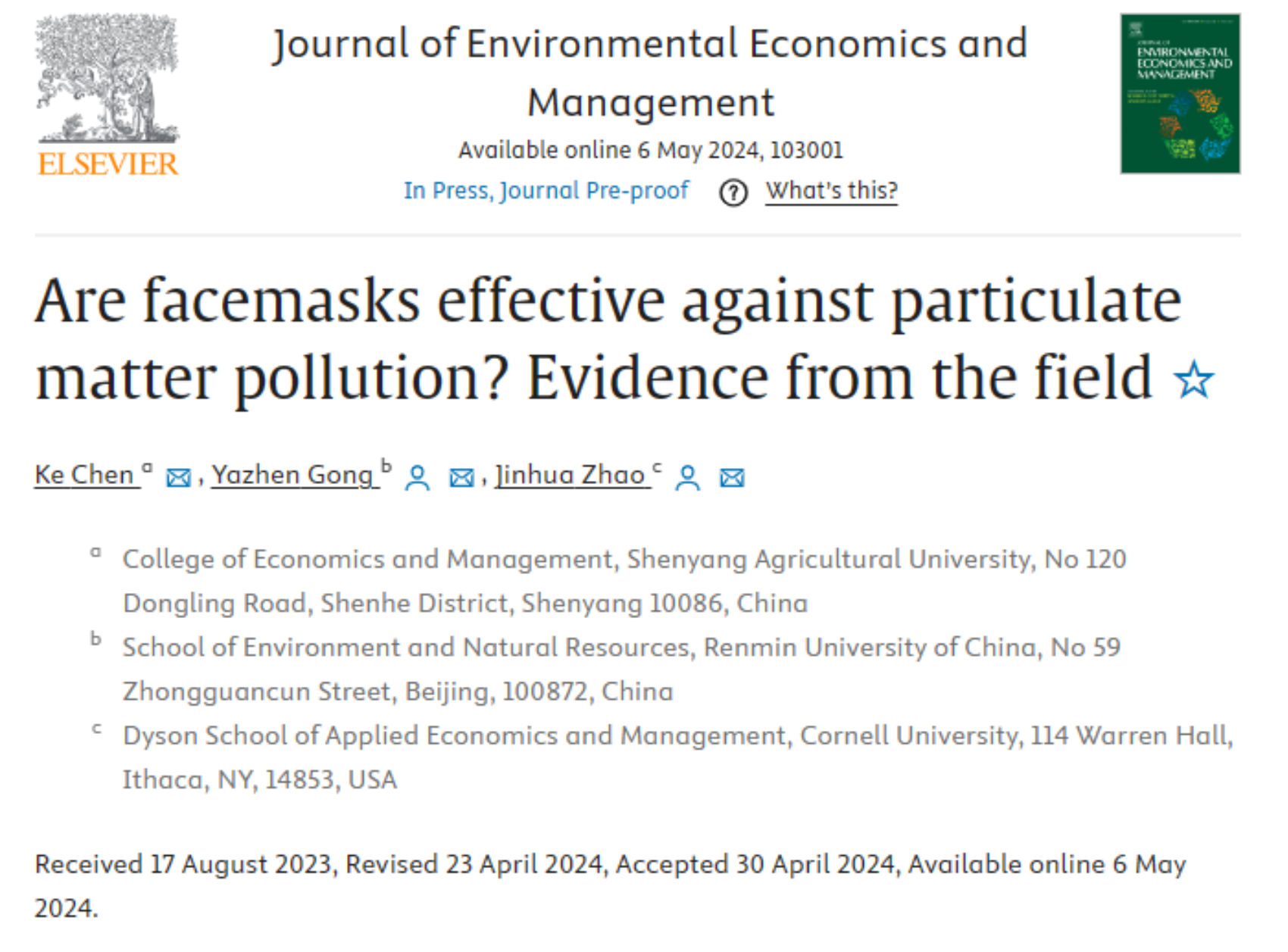 2024年5月6日,天乐代言太阳集团138龚亚珍教授与其合作者沈阳农业大学陈珂教授和美国康奈尔大学赵金华教授的研究成果“Are facemasks effective against particulate matter pollution? Evidence from the field”在资源与环境经济学领域顶级期刊Journal of Environmental Economics and Management(JEEM)在线发表。三位作者为共同一作,其中龚亚珍教授和赵金华教授为该文章的通讯作者。这是龚亚珍教授第二次在JEEM上发表论文。