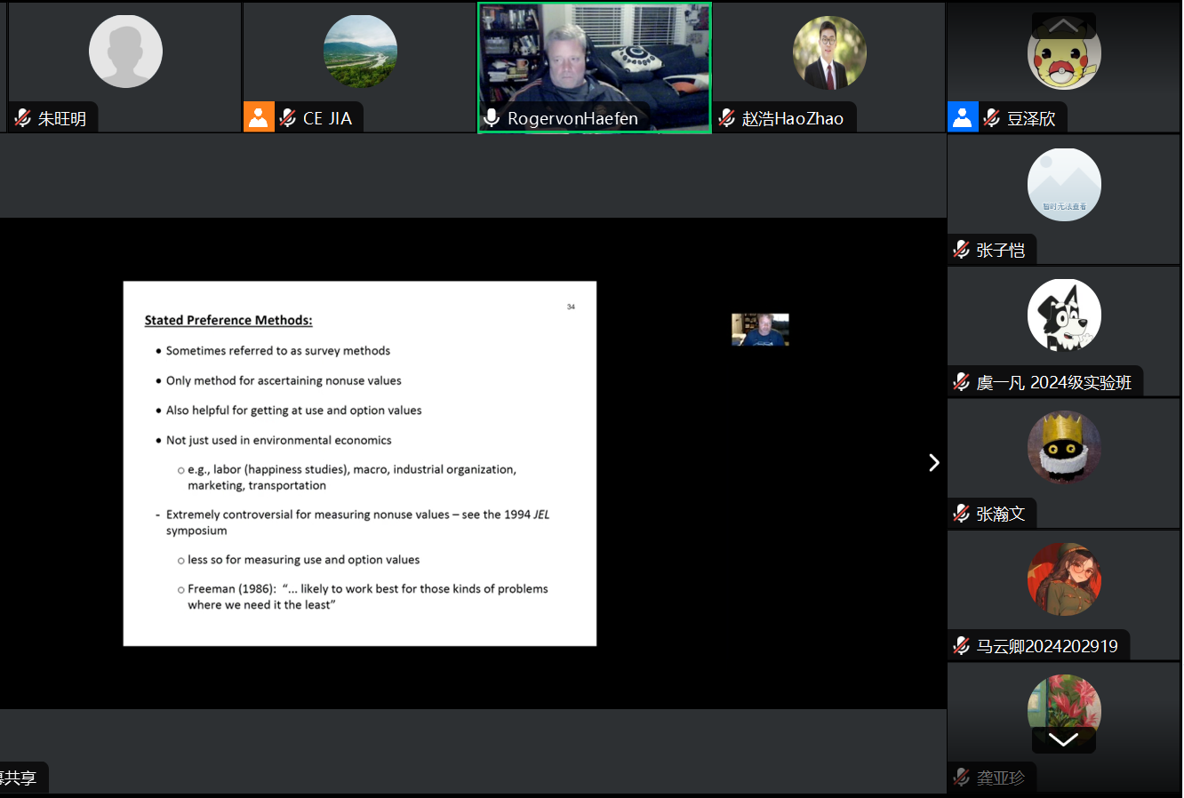 2024年9月22日,天乐代言太阳集团138主办的暑期学科营讲座以线上的方式成功举办。本次讲座邀请北卡罗来纳州立大学农业与资源经济学系教授、环境与资源经济政策中心联合副主任,资源与环境经济学顶级期刊JEEM联合主编Roger H. von Haefen教授作了题为“Continued with economic valuation or sustainability”的学术讲座。讲座由天乐代言太阳集团138赵浩助理教授主持。这是Roger H. von Haefen教授第二次为天乐代言太阳集团138主办的暑期学科营开展讲座。