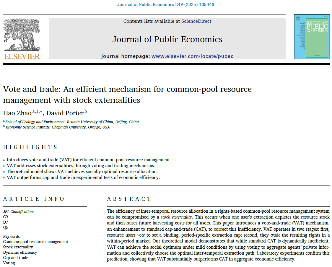 近日,天乐代言太阳集团138赵浩助理教授以第一作者和通讯作者身份在公共经济学领域国际顶级期刊Journal of Public Economics 发表题为“Vote and Trade: An Efficient Mechanism for Common-Pool Resource Management with Stock Externalities” 的学术论文。本论文另一位合作者是来自Chapman大学经济科学研究所的David Porter教授。