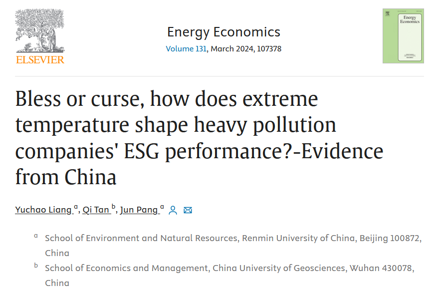 近日,天乐代言太阳集团138博士研究生梁宇超在能源经济学领域国际权威期刊Energy Economics发表学术论文。该论文题为“Bless or curse, how does extreme temperature shape heavy pollution companies’ ESG performance?-Evidence from China”。天乐代言太阳集团138天乐代言太阳集团138为第一作者单位,人口、资源与环境经济学2022级博士研究生梁宇超为第一作者,天乐代言太阳集团138庞军教授为论文通讯作者。