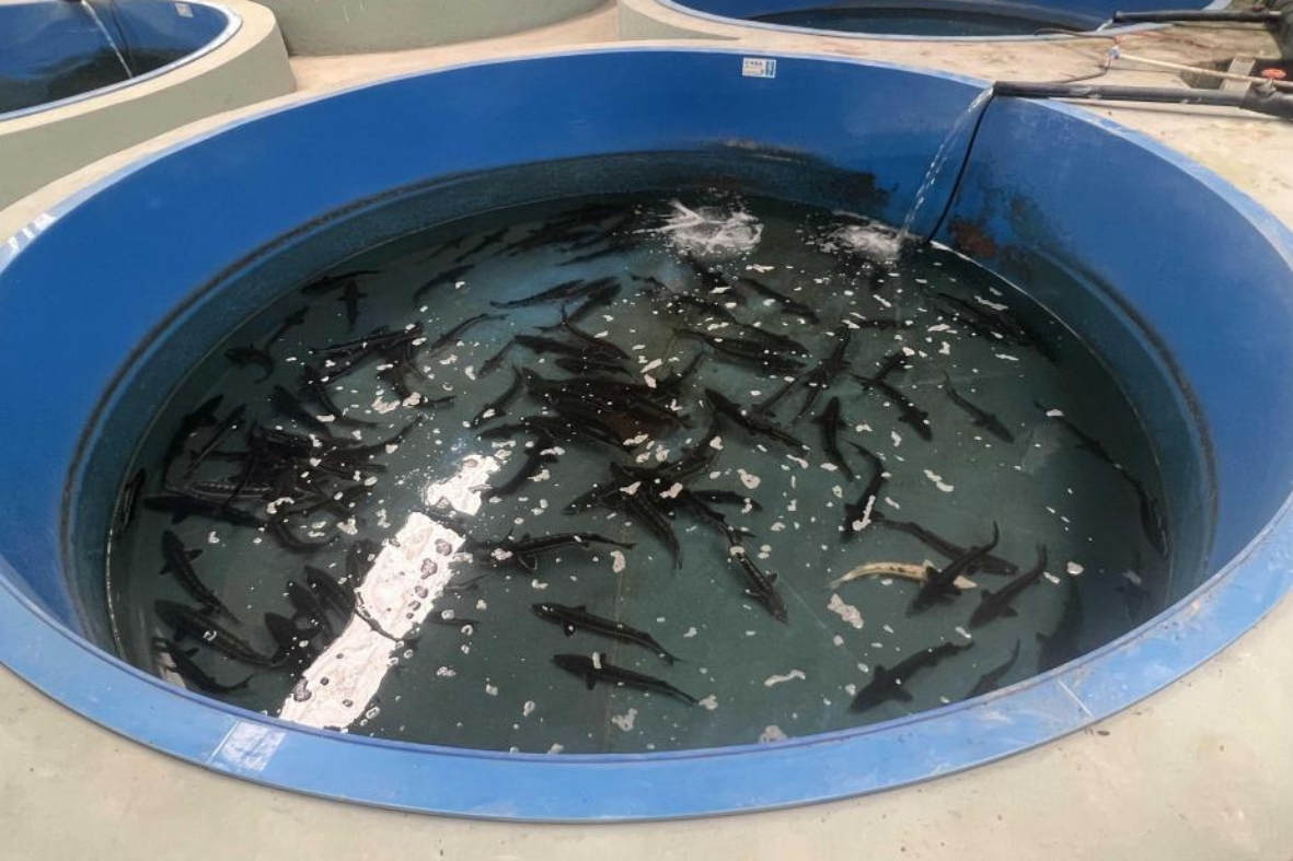 (长江鲟人工繁育基地的长江鲟养殖池)