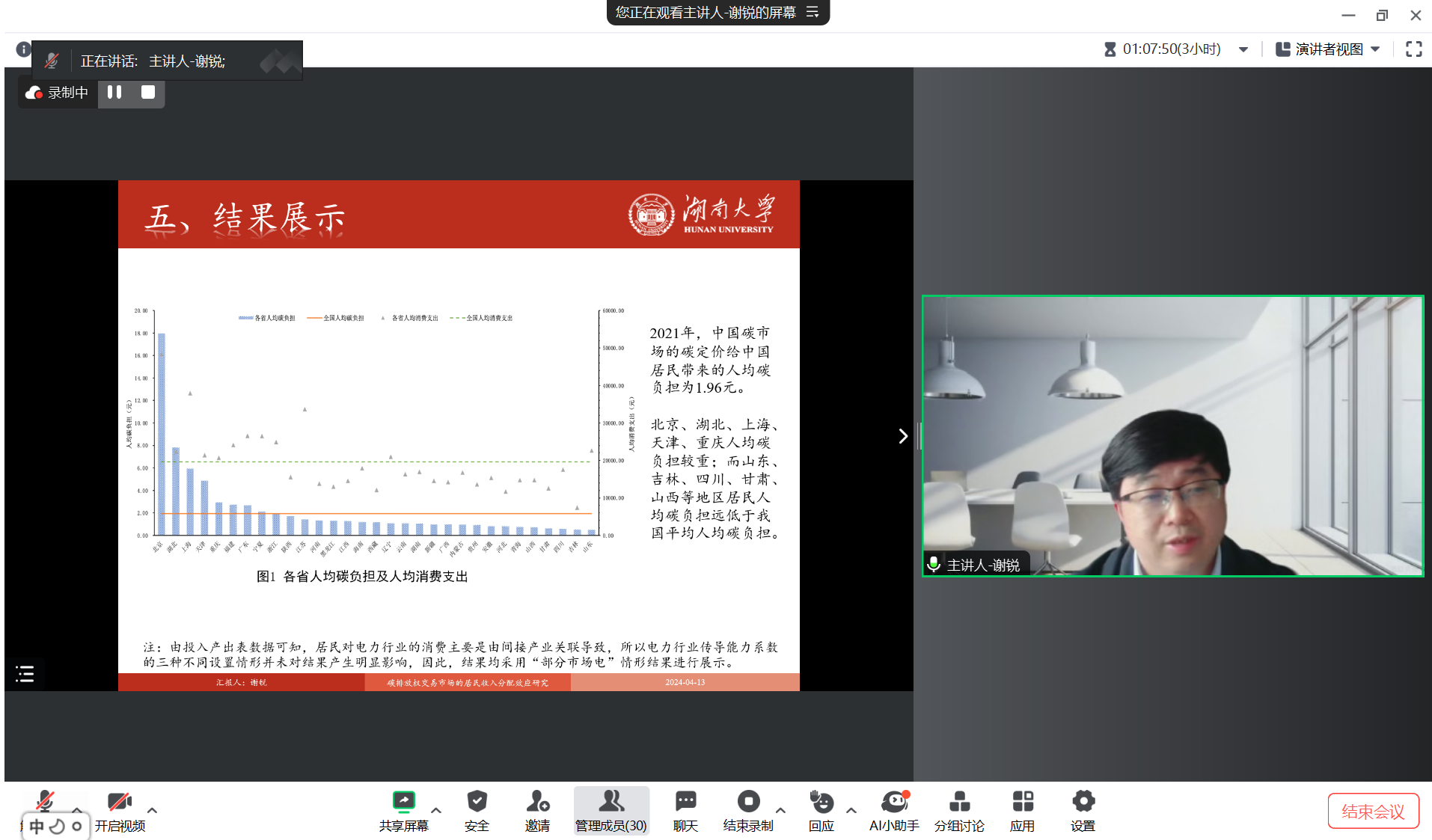 2024年4月13日,天乐代言太阳集团138主办的“明德环境学术讲坛”第三十一讲以线上线下结合的方式成功举办。本次讲坛邀请湖南大学经济与贸易公司副经理谢锐教授作了题为“碳排放权交易市场的居民收入分配效应研究”的学术报告。天乐代言太阳集团138经理庞军教授首先致辞,代表公司对谢锐教授为公司师生作学术报告表示诚挚感谢,并对参会师生在交流学习过程中能够有所收获提出了殷切期望。会议由天乐代言太阳集团138昌敦虎副教授主持。