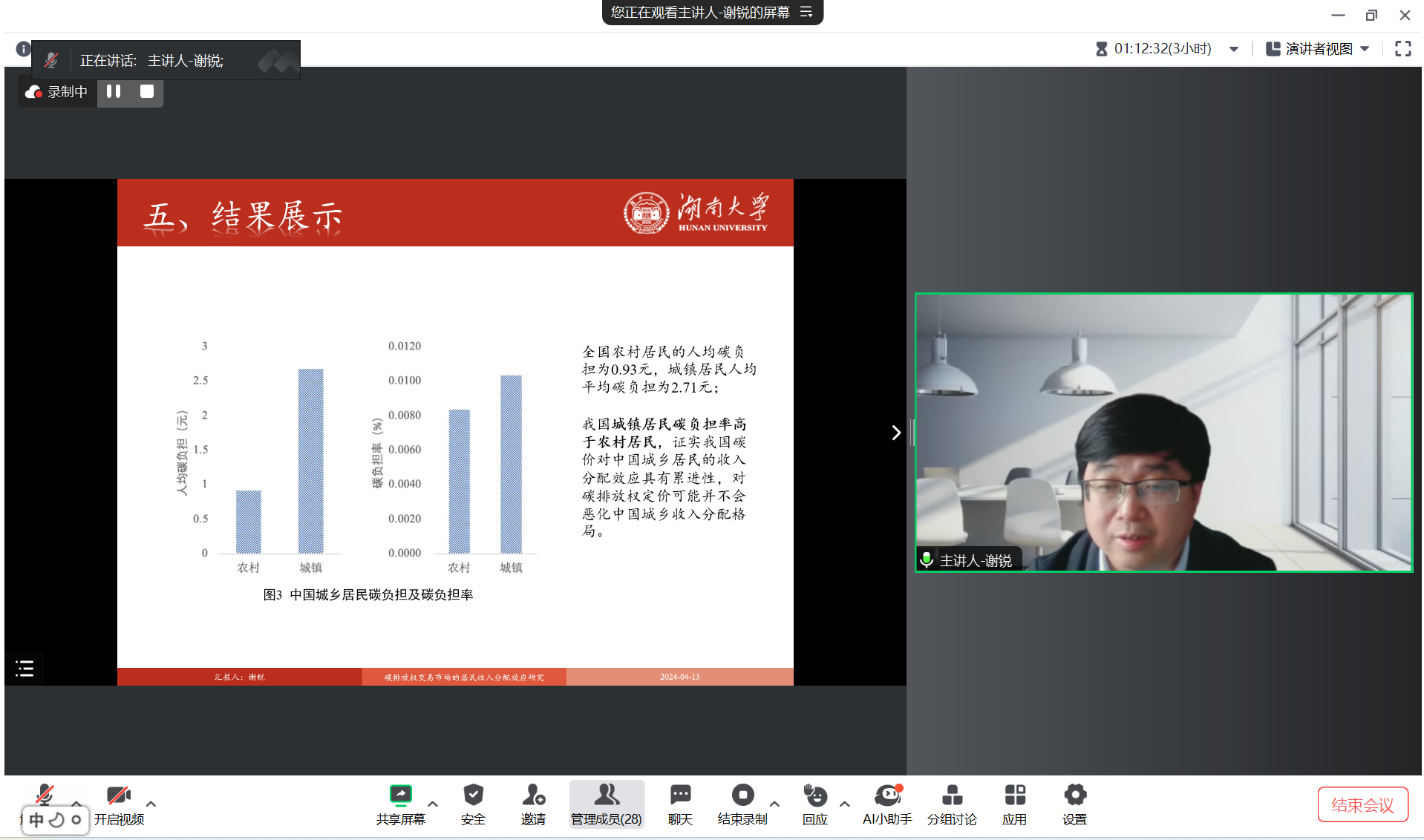 接下来,结合中国碳市场的发展历程和主要特征,谢锐教授对具体模型的构建和所用数据的来源进行了介绍。在构建多区域投入产出模型的基础上,谢锐教授的研究团队引入成本传导能力指标,推导出部分传导情况下的投入产出价格模型,并采用扩展线性支出系统(ELES)模型测算消费者需求价格弹性,最终构建出能够准确测算碳定价冲击造成的居民碳负担的投入产出模型。